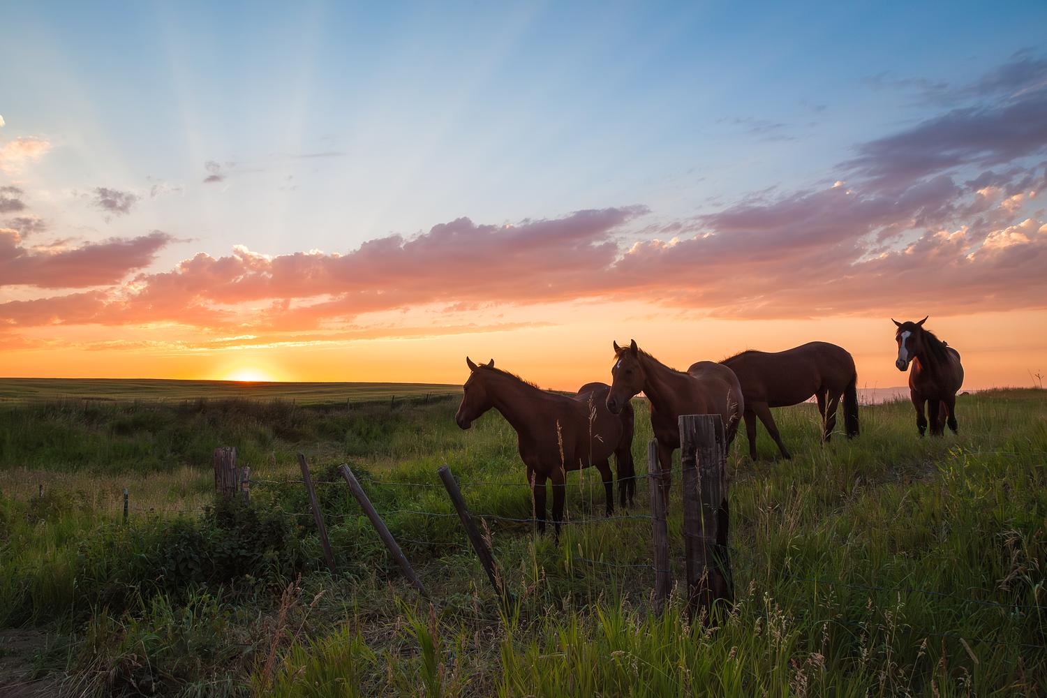 A group of horses during a summer sunset in Montana